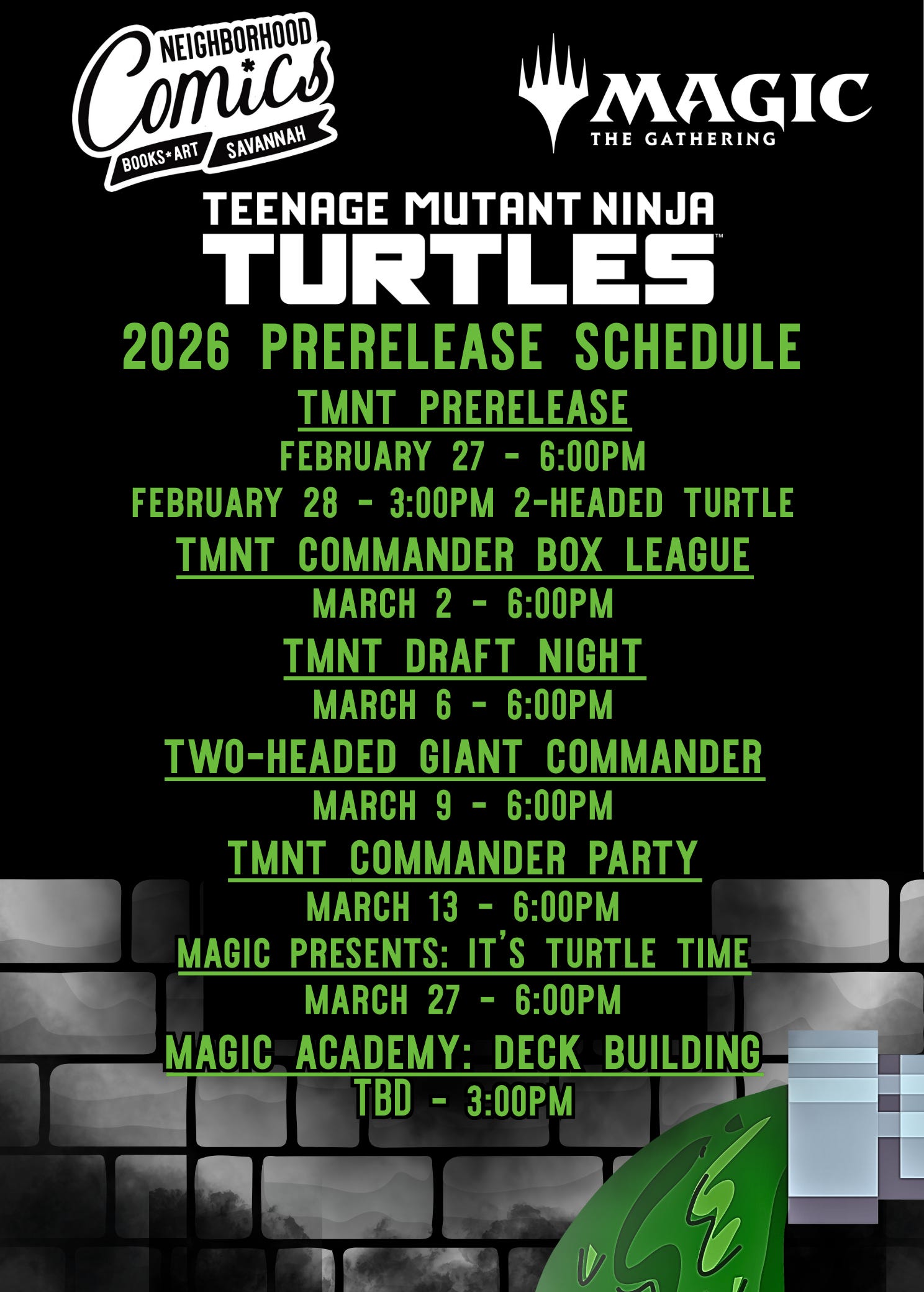 It is all about Community building. Lee and the team have done such an extraordinary job creating and supporting this “new wave” of Comic Shop experience in Savannah: a specific focus on the customer experience, intricately curating every aspect of the business, and reaching out to the overarching Sequa Community in the Savannah area to see what they need. So when Lee approached me about starting this up at NBRHD, there was a question that needed to be answered so we could continue to live up to the Neighborhood Culture: How does this support and improve our Community? The only reason we started playing at the shop was because you, dear reader, asked for it. We try to end every invitation to play with “New Players and New Faces Welcome!” In the last 4 months we’ve grown from me, Kevin, and Damani playing a 3 person Commander game, to a sold out, 24 person Prerelease event for the newest release, Lorwyn Eclipsed. I tell everyone who comes to play with us, at the end of the day, we’re here to have fun. Everyone mostly plays casual commander in pods of four, with a few standard players here and there. We do Limited events like Booster Drafts a few Friday’s a month. And we try to support every event that Wizards of the Coast throws our way so there is something for everyone. A lot of our players can walk or ride their bike to the store and many of them are first time players. We’ve got a store library of decks that people can borrow to play with, and we just started selling singles to support players and their deck building. Whenever I see a new player, I ask their name and write it down so I will remember (and dear goodness I try, so forgive me if I ever make a mistake!). At the end of the day, I really do think its our community that makes a difference. A lot of our players play at some of the other local stores, and I think that is great too. But I think we’ve got something a little special at NBRHD. And its not just the fact that we can someone fit 24 players in our little shop. The real Magic is the friends we ma- Jk. I’ve been told to stop saying that. But its true. This whole experience has been incredible for me, and I truly thank everyone who has come out to play this silly little card game with me. Hopefully I’ll see you at the next set release on February 27th - Universes Beyond: Teenage Mutant Ninja Turtles!