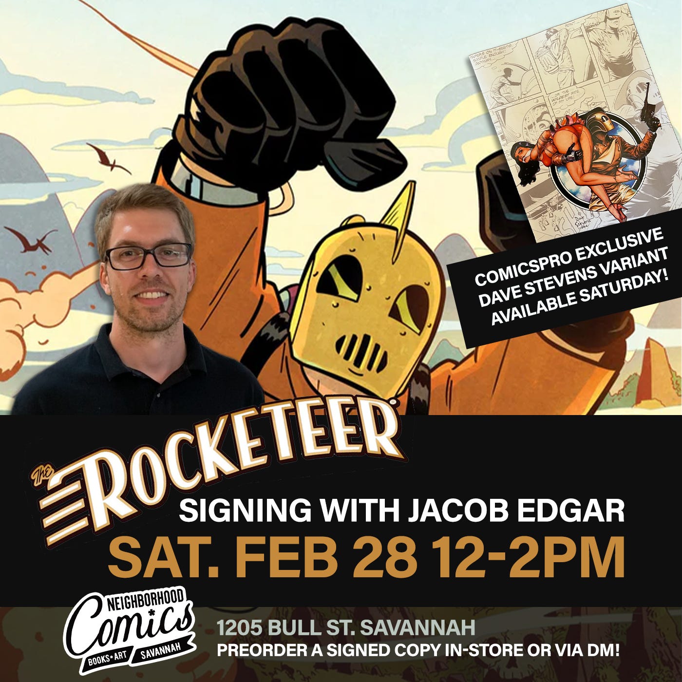Rocketeer artist Jacob Edgar is in the shop on Saturday to sign copies of his new book Rocketeer: The Island from noon to 2 PM. We will also have exclusive ComicsPro variants of the book with a Dave Stevens cover available.