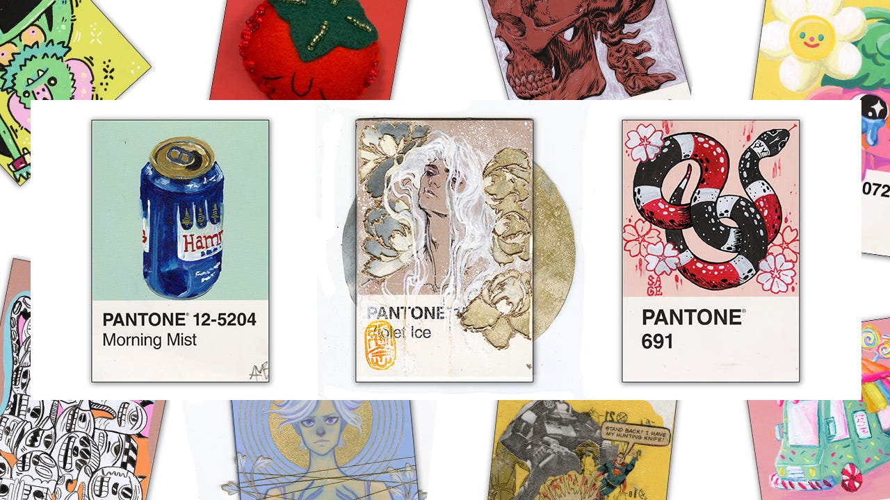 Pantone produced a set of 100 postcards to celebrate the diversity of its collection and its place in the designer pantheon of tools. We decided these mini canvases would be the perfect way to show the diversity of our creative scene and organized an art show around the format. We put out a call for art and the response was overwhelming, quickly growing to a waiting list. We’re so happy to share these finished pieces with you now.